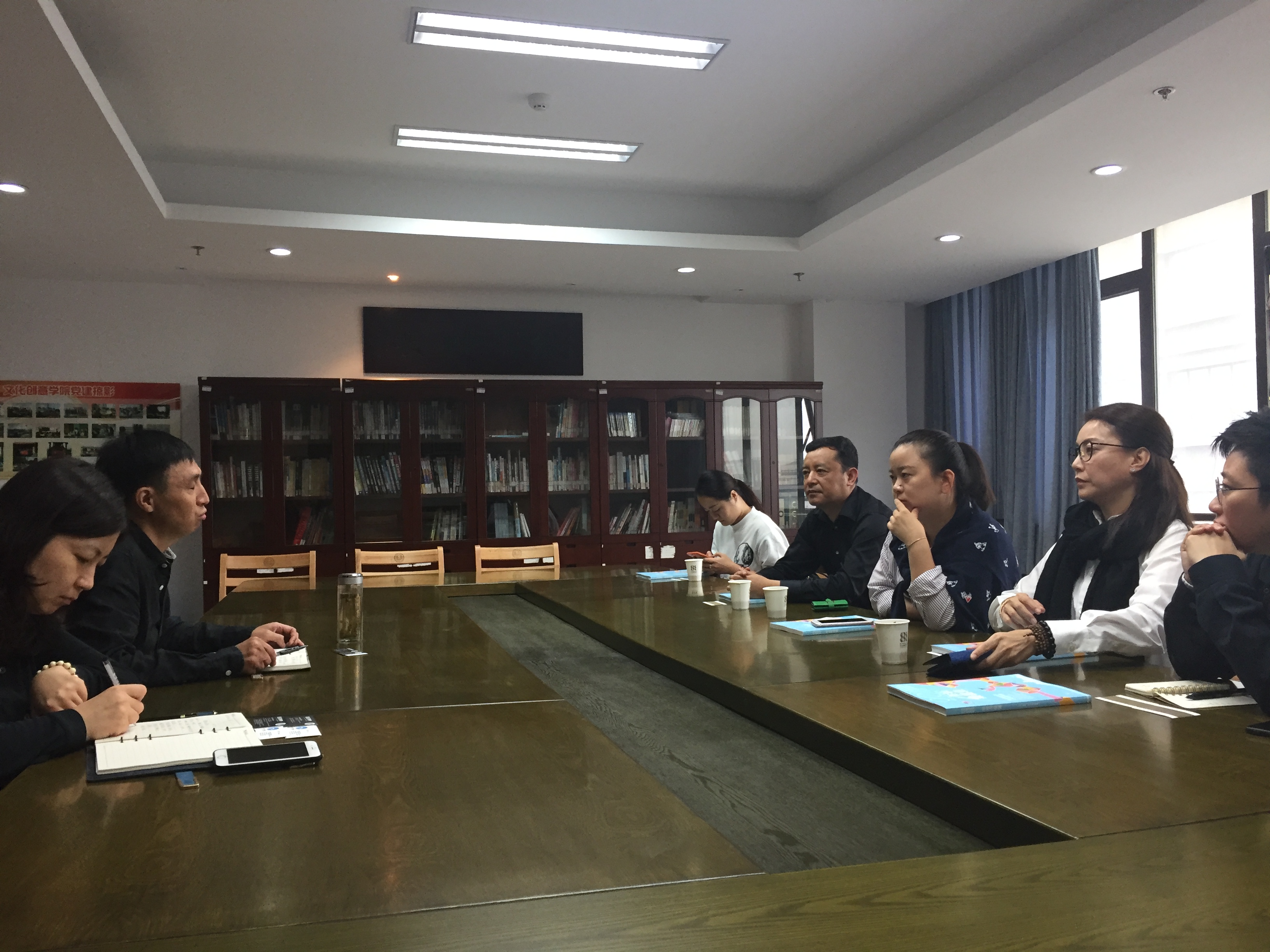 10月11日上午10点文创学院郭持华副院长和副书记周微微在恕园1-402会议室,与英皇娱乐(香港)营运总裁  霍汶希女士 ,英皇娱乐(北京)项目总经理黄颖茵女士,浙江卫视“蓝天下传媒”总裁 章碧珍女士就影视编导、后期编辑结合学院在数字媒体影视和文化产业策划管理课程建设方面开展合作意向的洽谈。