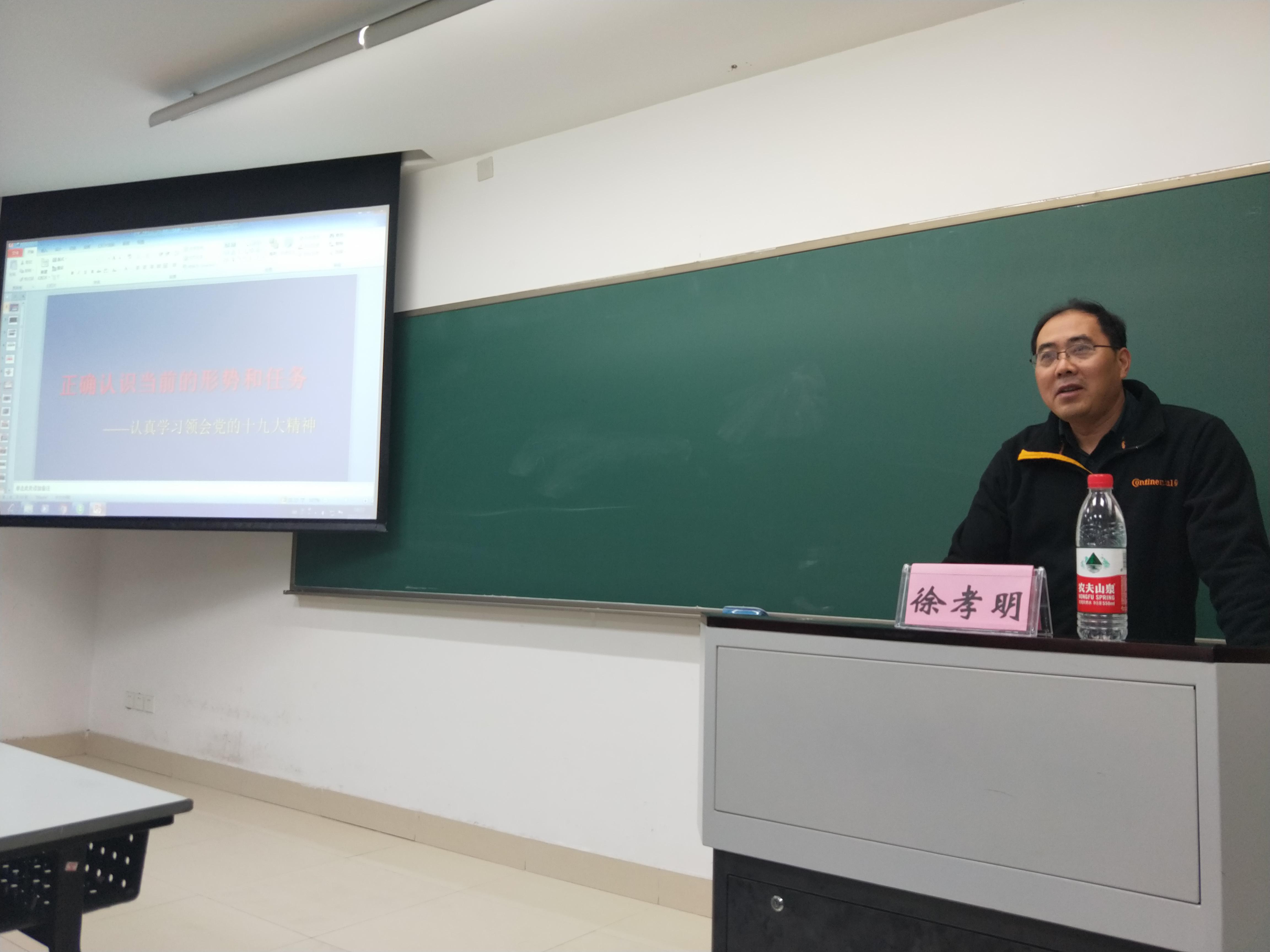 2017年11月14日晚,培训班邀请了马克思主义学院的徐孝明老师在名为《正确认识当前的形式与任务》的专题党课上为大家深入解读了党的十九大。维度上包括了时间维度、空间维度,内容上包括了中国特色社会主义进入新时代、新时代面临的新形势、新时代:新征程、新起点、新时代对党的建设新要求:展现新气象四大方面。在徐老师的帮助下,党课学员们对于党的十九大有了更加深入、全面的了解。