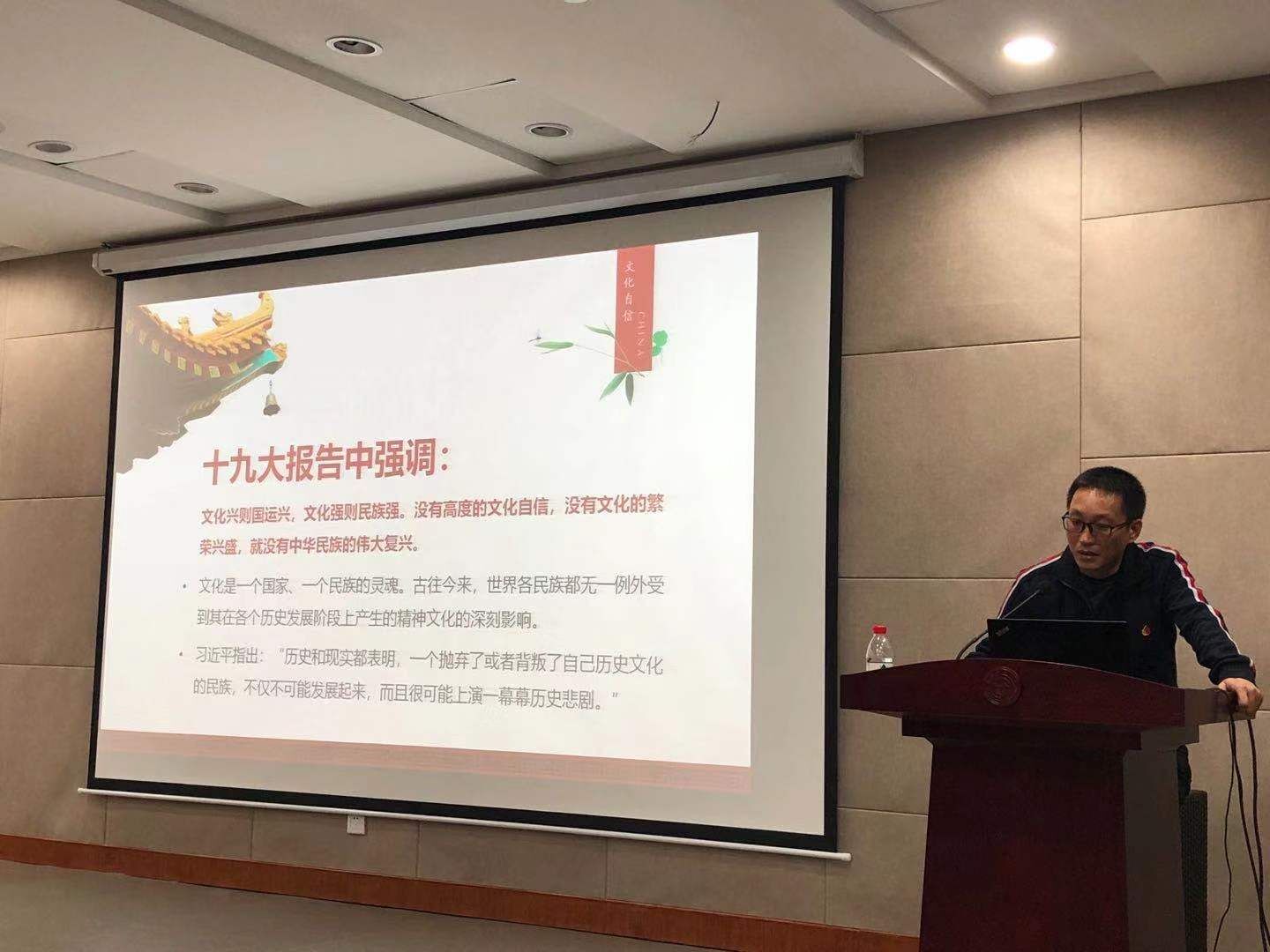 随后,学院党总支书记范小春为大家带来了一场《坚定文化自信,实现民族复兴》的爱国主义教育讲座。范小春同志从新中国成立后70件具有标志意义事件的照片引入此次讲座,并从如何坚定文化自信、文化自信的底气、文化自信的重要性三个方面进行展开。范小春提到,作为文化创意学院的教师和同学,动画、数字媒体、文化产业管理专业是讲好中国故事的主力军,坚定文化自信非常重要。教师要通过主题学习焕发出来的强大热情和干劲,投入到立德树人的教育工作实践中去,同学要树立积极的精神面貌,为实现中华民族伟大复兴贡献力量。