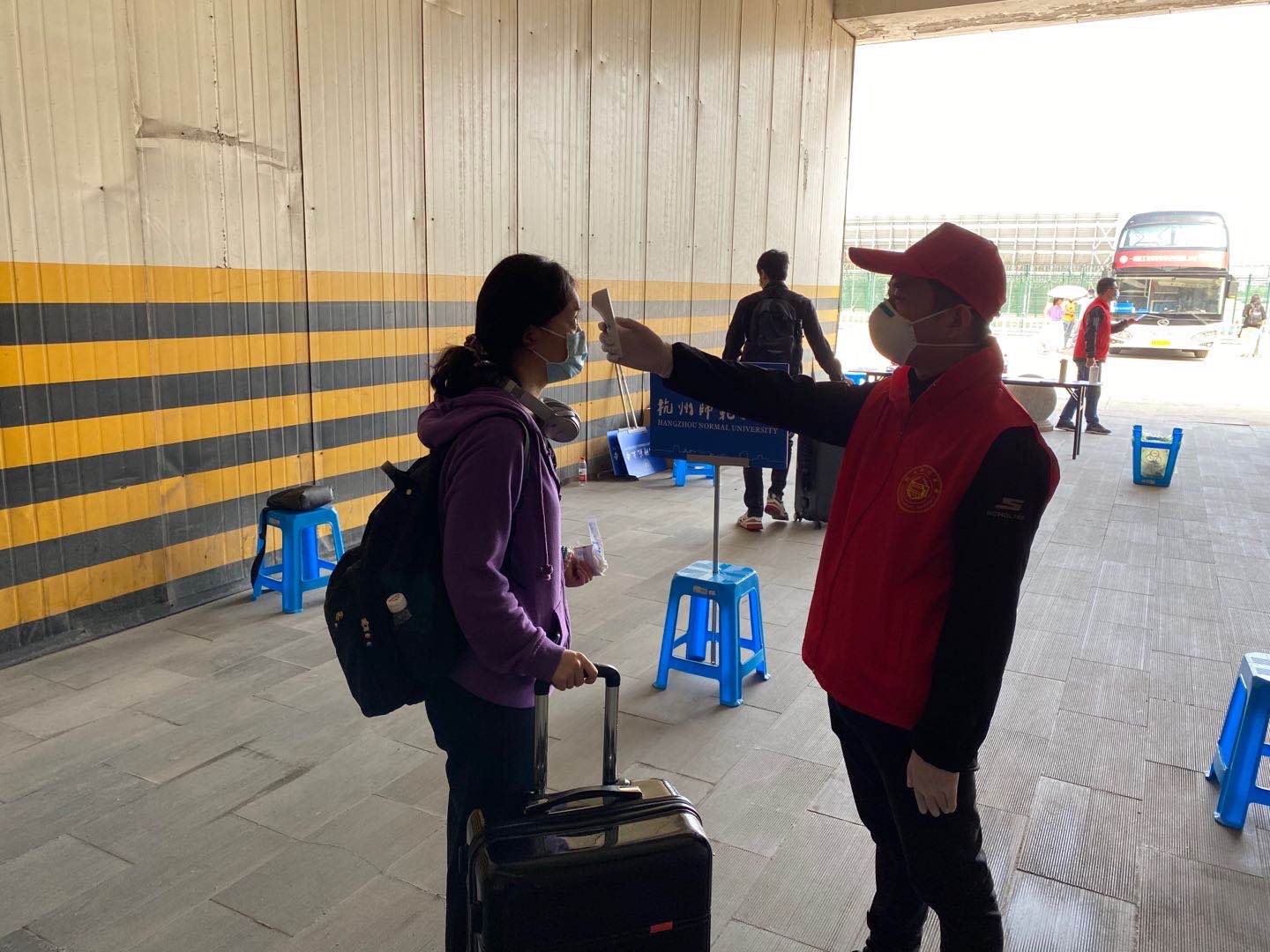 负责接站工作的第一组教师志愿者早已集结在杭州火车东站,迎接返校学生。他们拿着体温检测仪,耐心仔细地给每位学生测量体温,并对学生行李进行消毒,引导学生用消毒液洗手、双脚踩消杀地毯消毒后,有序上车。