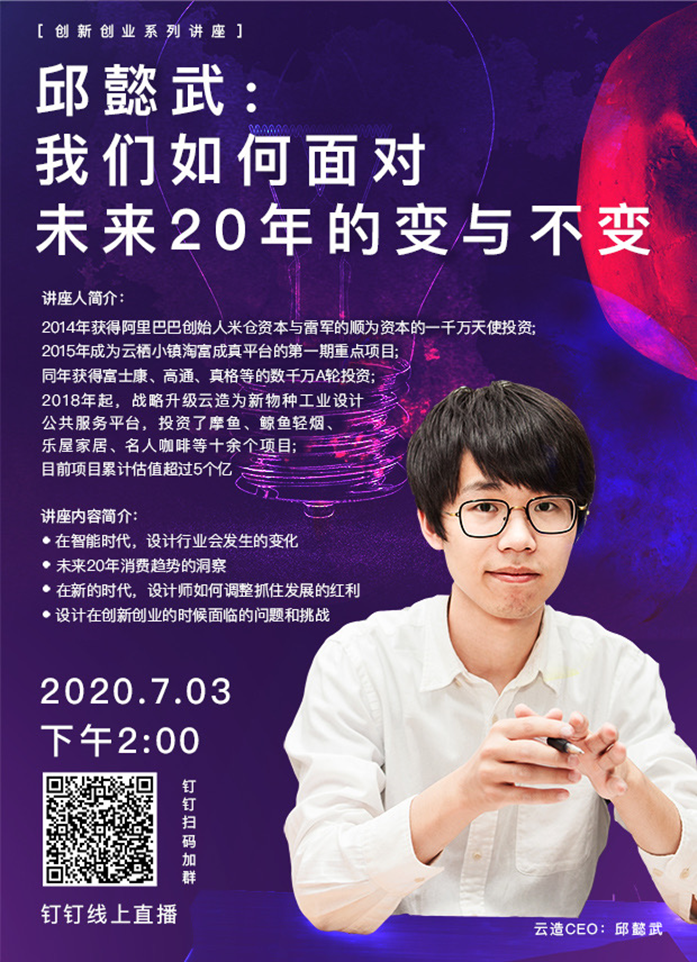 讲座时间:2020年7月3日下午14:00,杭州云造科技有限公司邱懿武,应文化创意学院邀请,在线上开展主题为“我们如何面对未来20年的变与不变”的创新创业系列讲座。