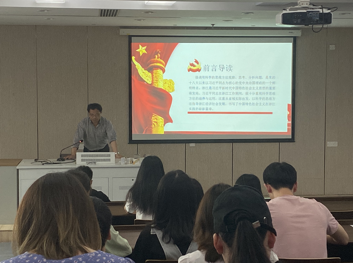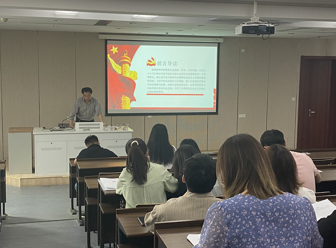 会议伊始,杨欢耸副院长从习近平在浙江工作期间对战略思维方法的探索与实践、习近平在浙江工作期间运用战略思维方法的主要特征、增强战略思维能力奋发有为推进省域现代化先行三个部分出发,具体、全面地讲述了浙江在发展中结合运用习近平同志科学的思维方法的重要性。杨欢耸副院长并在党课中指出,当今身处世界百年未有之大变局,浙江正在奋力打造新时代全面展示中国特色社会主义制度优越性的重要窗口,作为身处浙江高校的党员,应深入了解浙江“八八战略”等科学思维,强化战略思维能力,提高对重要战略的认识与了解,坚定不移赓续“八八战略”,擦亮“重要窗口”。