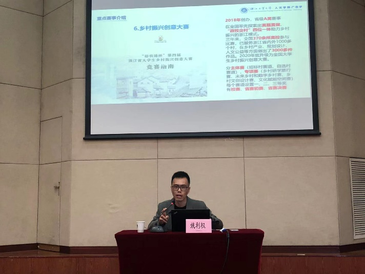 讲座伊始,姚利权教授向同学们介绍了目前文科类学生的六大重点赛事,分别为挑战杯、“互联网+”、大广赛、学院奖、会展策划创意大赛、乡村振兴创意大赛。