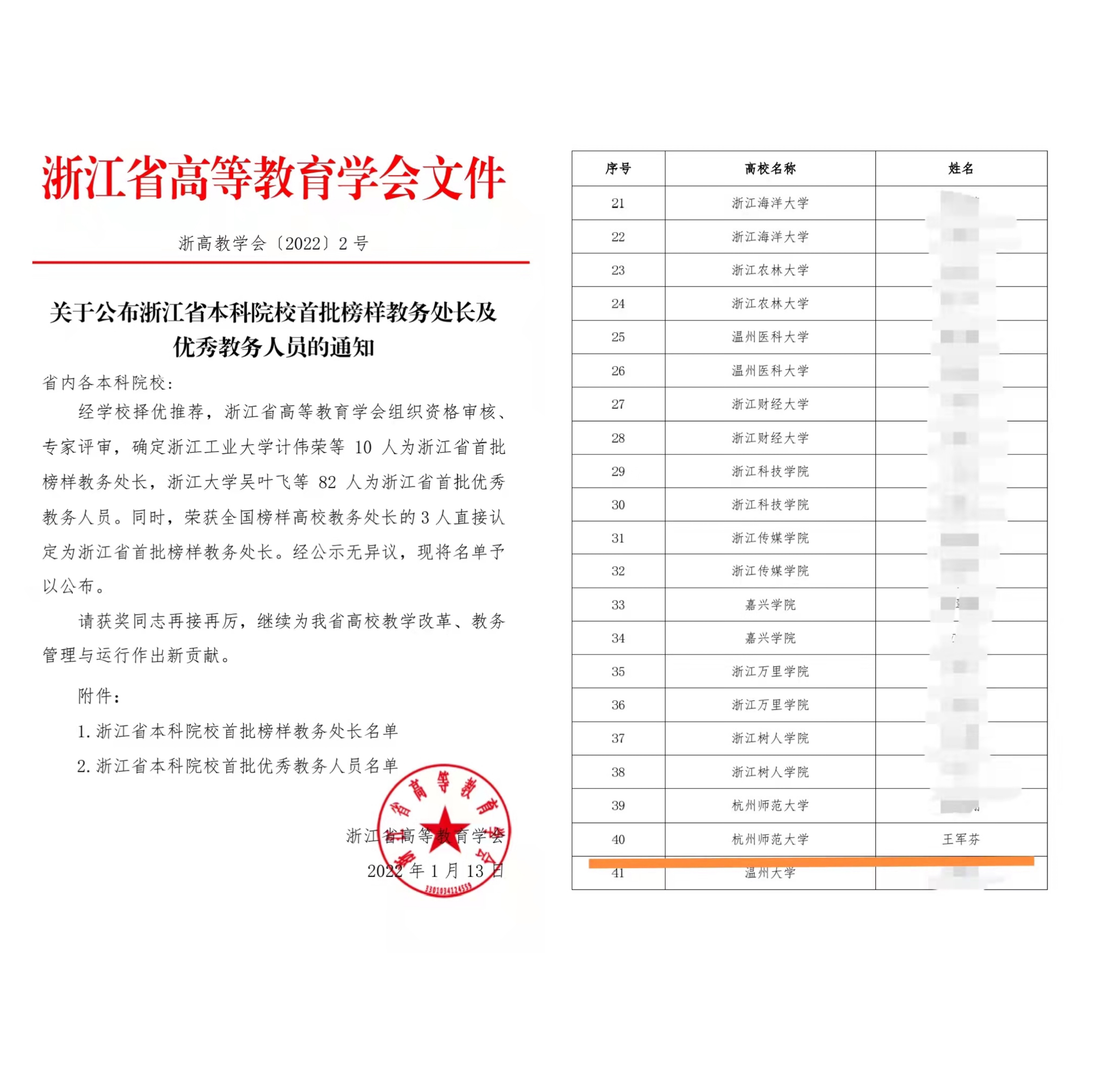 近日,浙江省本科院校首批榜样教务处长及优秀教务人员名单面向社会公布,蜜桃视频 王军芬老师荣获浙江省本科院校首批优秀教务人员。