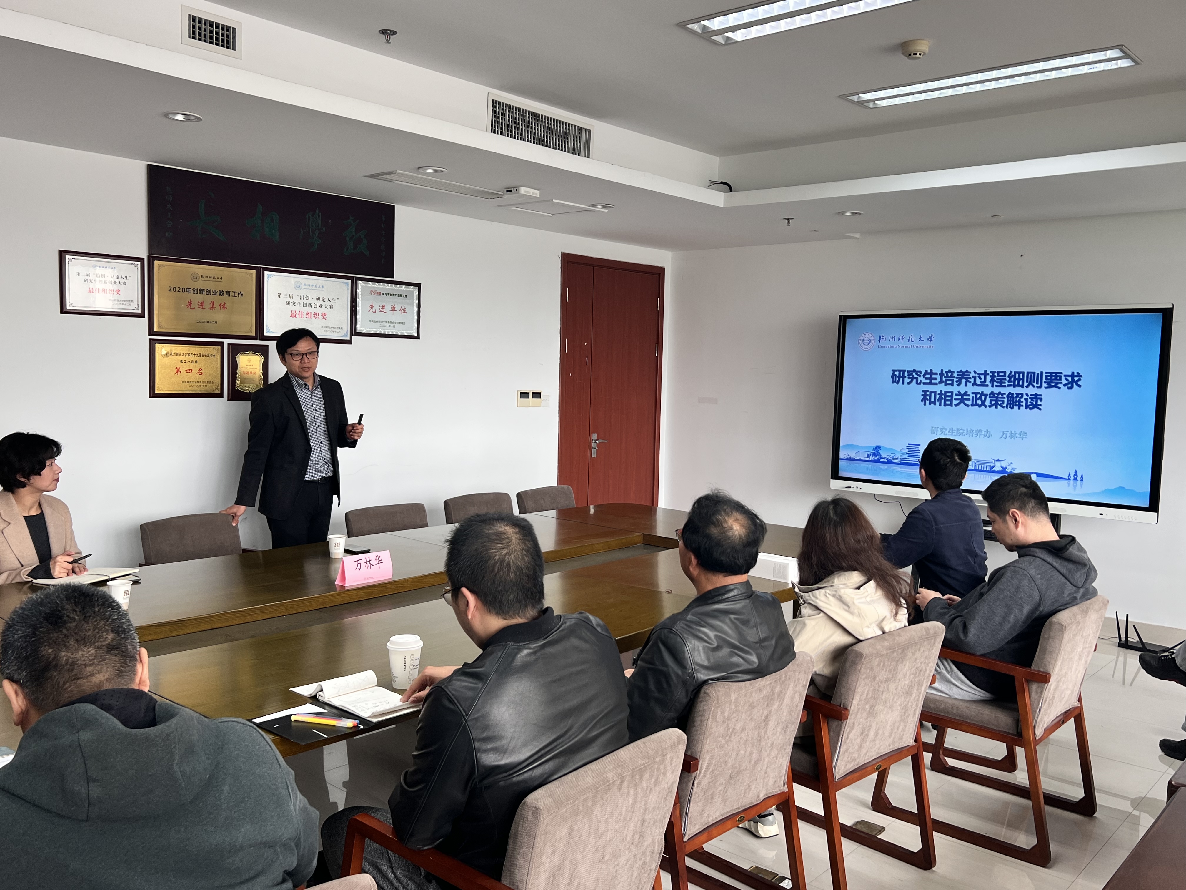 近日,为更好的提升研究生培养质量,优化研究生教学与管理,学院邀请校研究生院培养办主任万林华老师来蜜桃视频 做专题讲座,讲座围绕研究生培养细则要求及相关政策解读展开,梳理了针对研究生层面,省里乃至国家级项目与成果申报的具体内容。本次会议由袁瑾副院长主持,蜜桃视频 全体研究生导师参加。