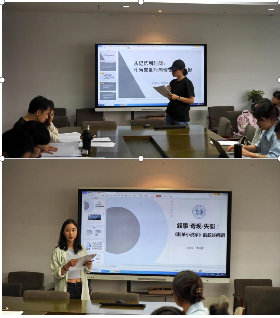 王珂昕同学以故宫为例,进行了新媒体背景下文化产业创新发展的研究。范佳琦同学从记忆到时间的维度,论述了作为双重时间性的迷影电影。李尚真同学从叙事、奇观、失衡的角度,探讨了《刺杀小说家》的叙事问题。倪小婷同学对“乡村科幻”电影中的城市文化想象与科技消解研究进行了汇报。童亦宁同学对奉俊昊现实主义的叙事风格研究进行了汇报。姜帅同学围绕交互电影,就艺术史下电影语言演进的必然选择进行了论述。周欣欣同学展示了人文微纪录片《千岛湖移民》,短片纪录了淳安第一代移民徐庭香奶奶的返乡之旅。江志文同学展示了动画短片《亚运一分钟》,并介绍了团队合作的历程。董建中同学与庄靖同学展示并介绍了独立纪录片《清醒边缘》,并以片中的摄影技术及拍摄进度安排与老师展开讨论。