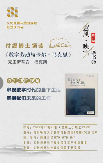 10月26日19点整,由文化产业管理系主办的蕙风·映雪读书会第五期在恕园1号楼402会议室联合腾讯会议同步展开。本次读书会聚焦的著作是克里斯蒂安·福克斯的《数字劳动与卡尔·马克思》,由付缦老师领读,别君华老师主持对谈,俞香云老师、杨帆老师、沈松华老师参与活动。
