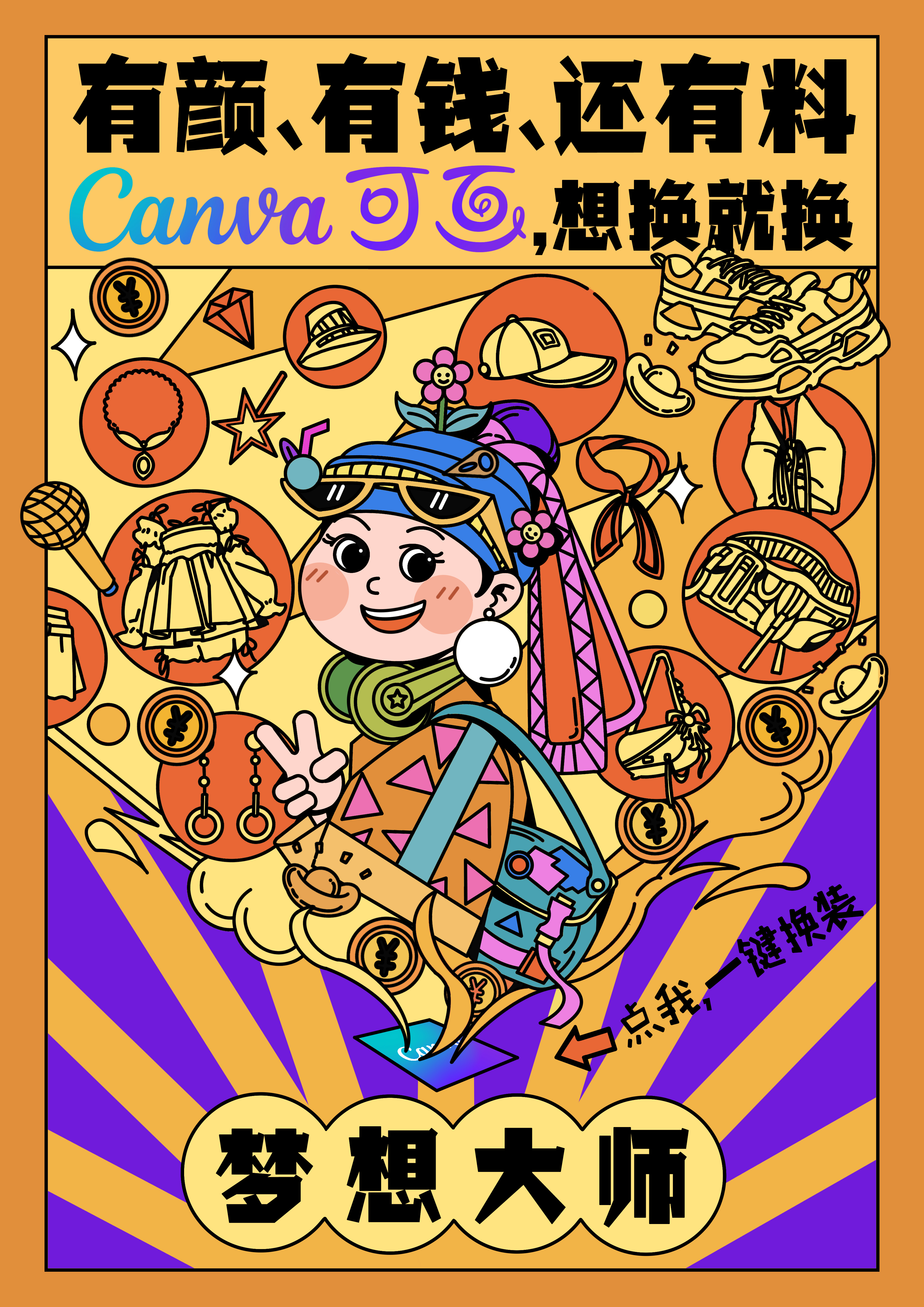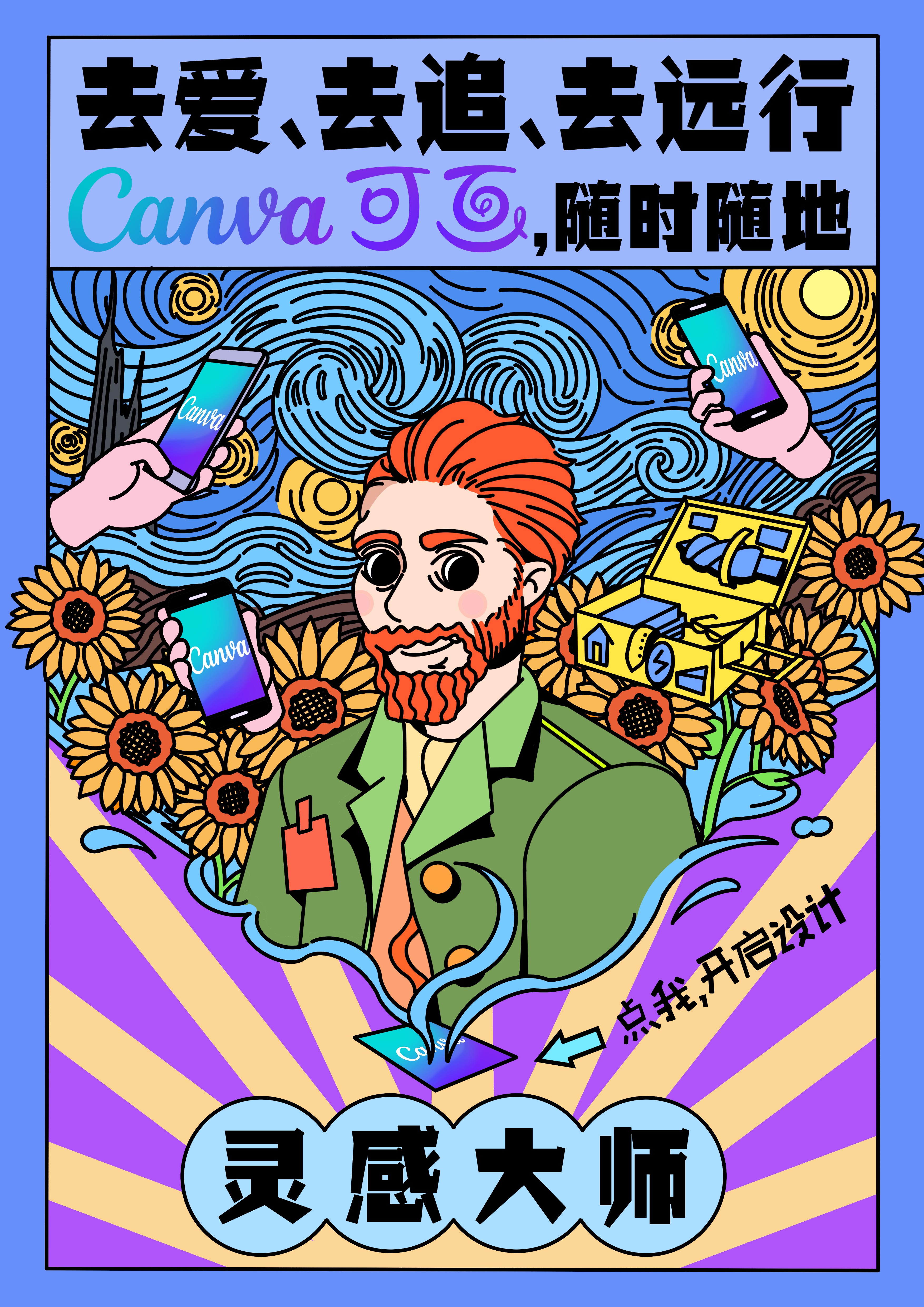 用canva可画 你也可以成为未来大师!画面采用三幅世界名画(戴珍珠耳环的少女 蒙娜丽莎 梵高自画像)与可画的具体功能相结合。凸显“可画”想换就换的操作便捷性,随时随地的工作高效性,以及给身边人带来惊喜的仪式感。同时研究了年轻人的特性,采用了更适配年轻人的标语。用“可画”,下一个未来大师就是你!