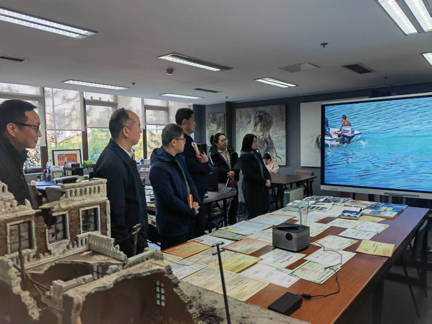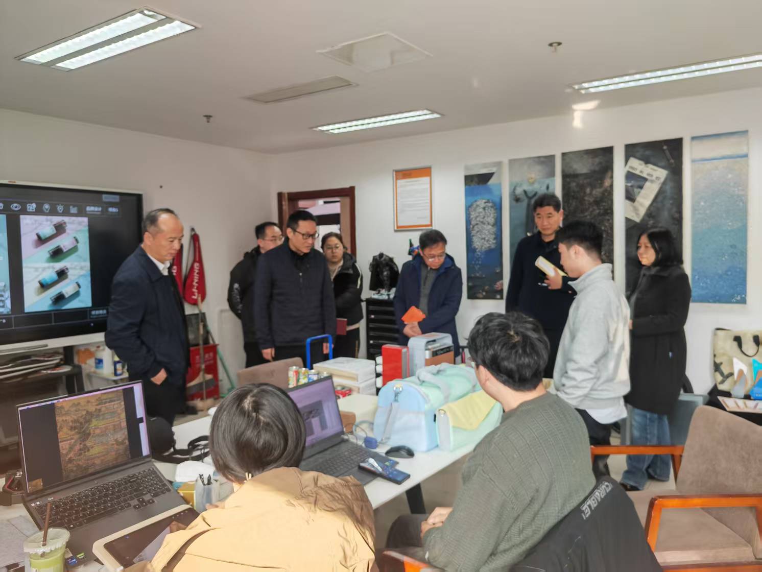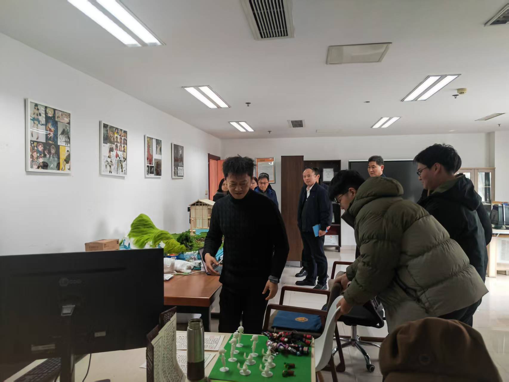 丁向崧一行首先参观了学院研创中心呈现的动画设计类、文创设计类、动漫设计类、产品设计类、影视短视频类与公益广告相关的作品。随后院长范小春介绍了学院目前发展建设与师资现状情况。杭州市文明办副主任丁向崧从成立创作联盟单位,以及如何从公益广告传播学术上理论研究提供支持,结合师生创作成立合作基地,让高校的公益广告研究和创作通过合作去市场检验几个方面提出合作的想法和思路。华数集团党委委员王明华从杭州文创之都和人工智能背景下结合公益特色如何合作创作各类公益广告作品,如何推送宣发渠道,提出具体想法。
