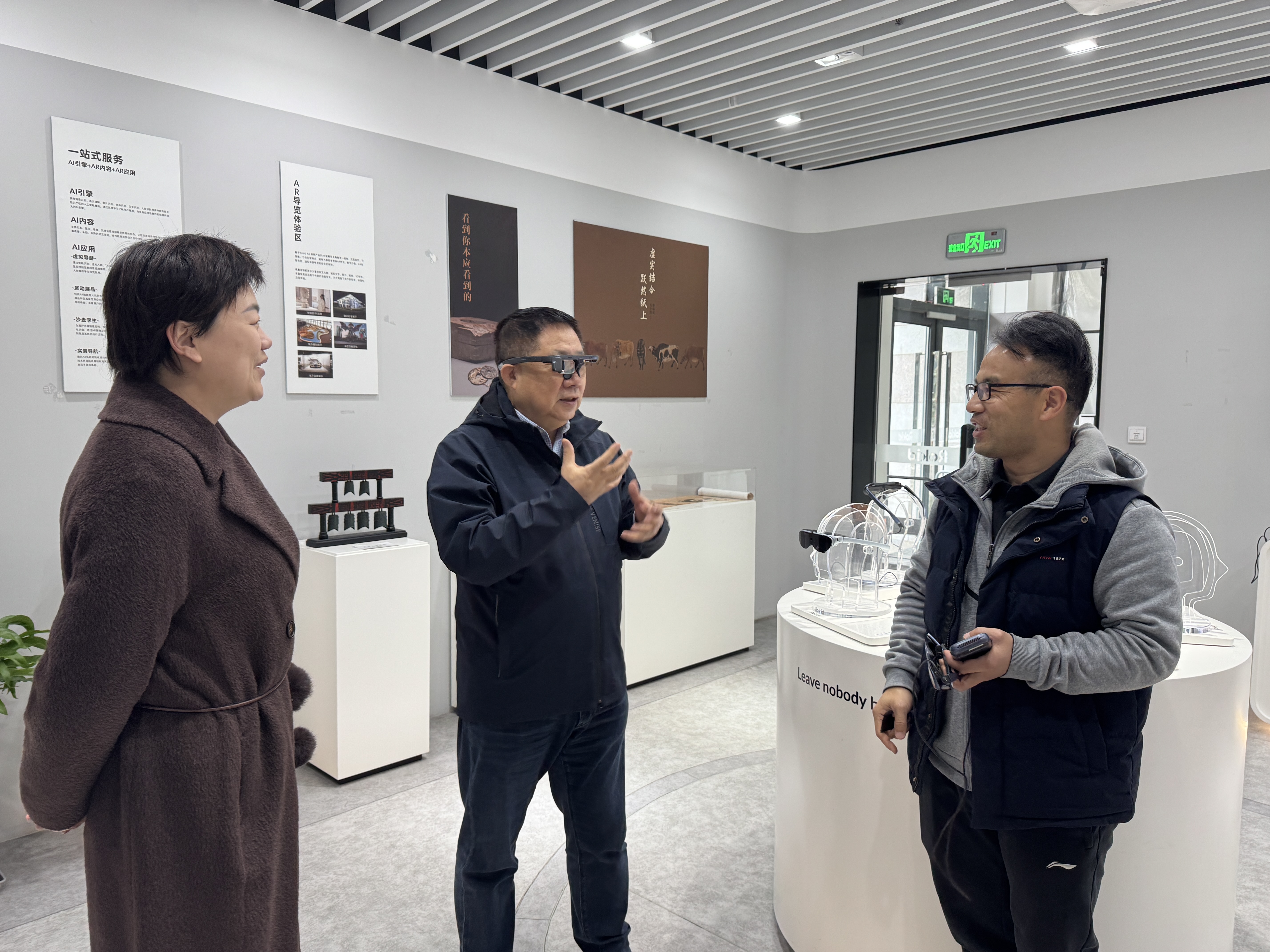 杭州灵伴科技有限公司(品牌:Rokid),公司负责人祝铭明前段时间在余杭区举行的经济高质量发展大会上,戴着最新款AR眼镜Rokid Glasses,指出“发言稿就在我的眼镜里,翻页通过手上的戒指完成”引发众多网友关注。范周院长一行参观了灵伴科技产品展厅,在公司负责人的指导下体验AR眼镜。