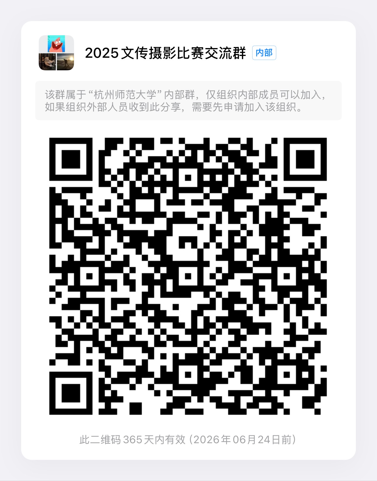 竞赛通知及后续信息核对会通过钉钉群,请在报名后务必钉钉扫码加入群组“2025文传摄影比赛交流群”
