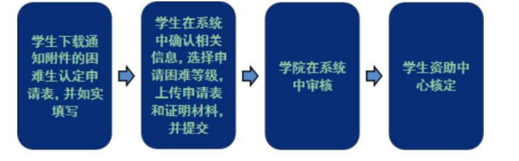 本科生困难生认定工作在“学生工作管理服务平台”(以下简称“学工平台”)(//xgxt.mitaohub.net/)中进行。具体流程如下:
